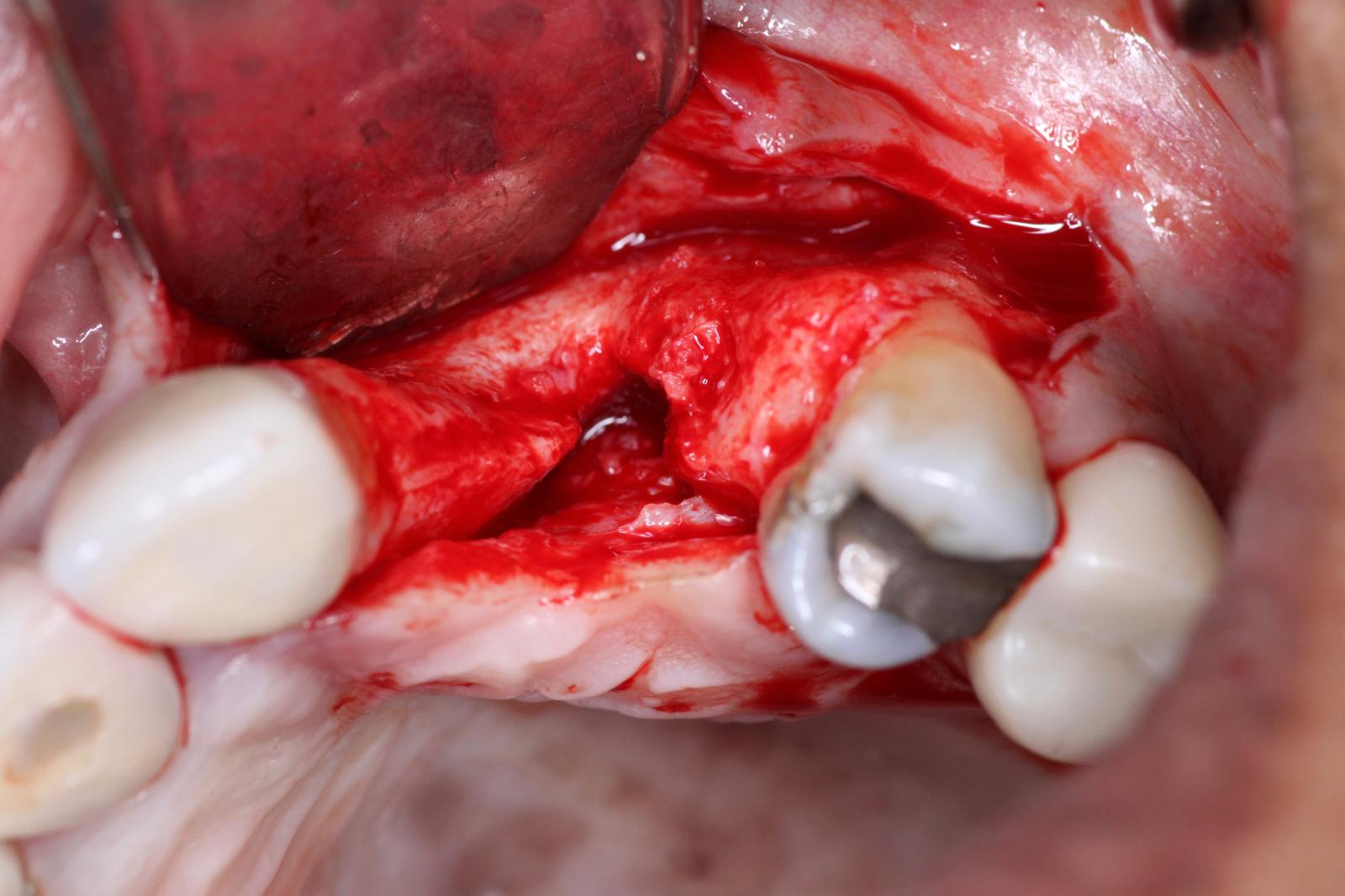 A Full thickness flap was reflected to expose the defect. You can see how severe the defect is, in both the vertical and horizontal dimensions. This is going to be a challenging GBR procedure, and we wanted to use the best materials at our disposal to encourage bone growth.