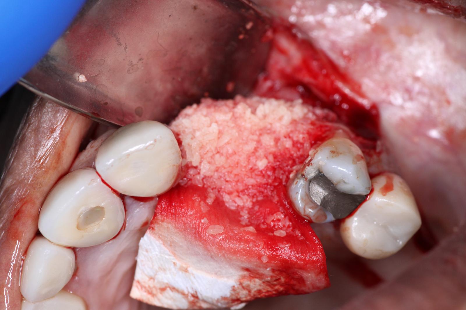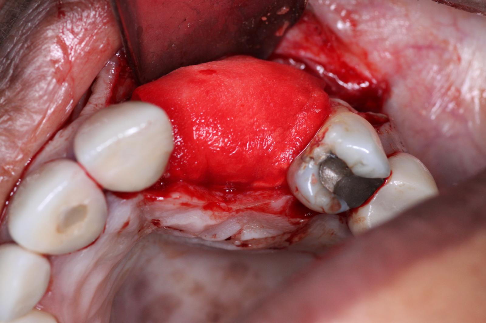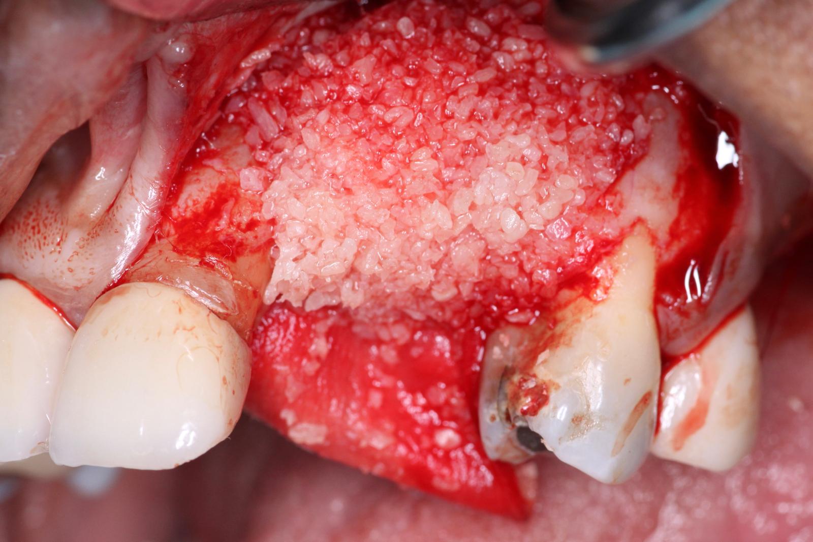 In the second part of our grafting technique, a DALI Amnion Chorion Membrane was layered over the bone graft, before we covered the entire site with a collagen membrane. The rationale for using an Amnion membrane here is that given the difficult nature of this GBR, we wanted to take advantage of the unique biological benefits of Amnion membranes, such as their inherent growth factors and anti-bacterial properties, to maximize the healing of the site and and enhance regeneration. For additional information on using Amnion membranes for this purpose, please see Enhance GBR and Improve Implant Surgical Outcomes with Amnion-Chorion Membranes
