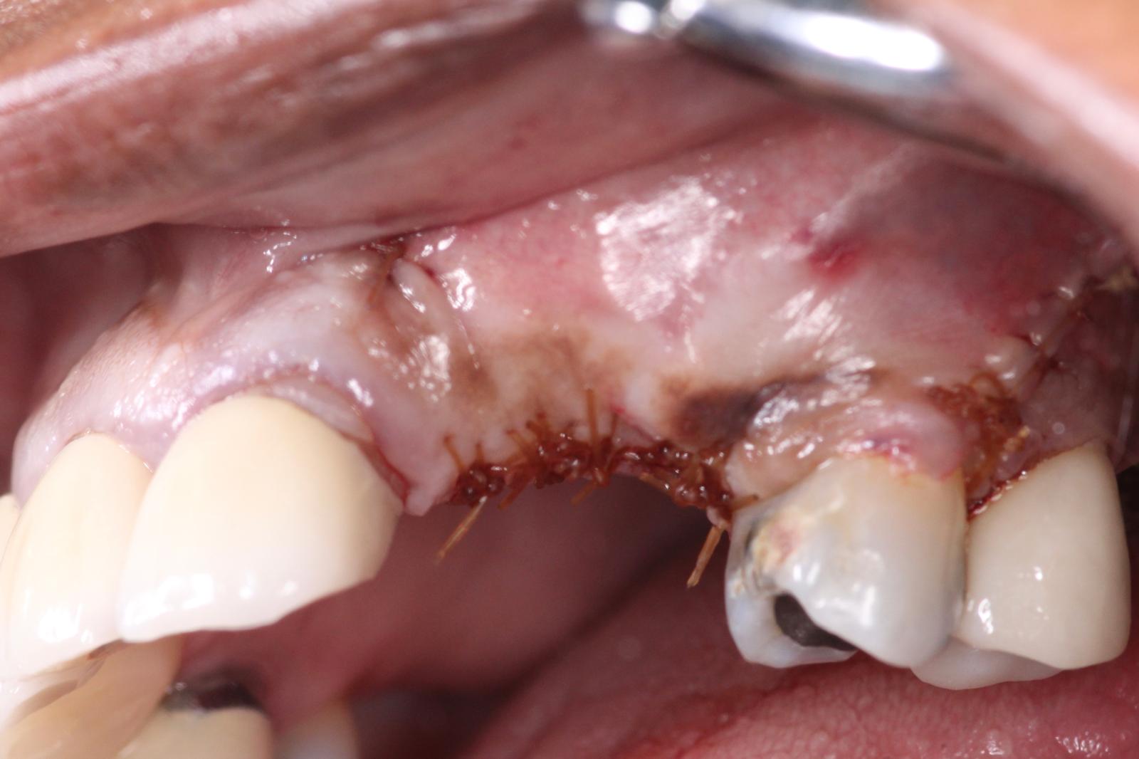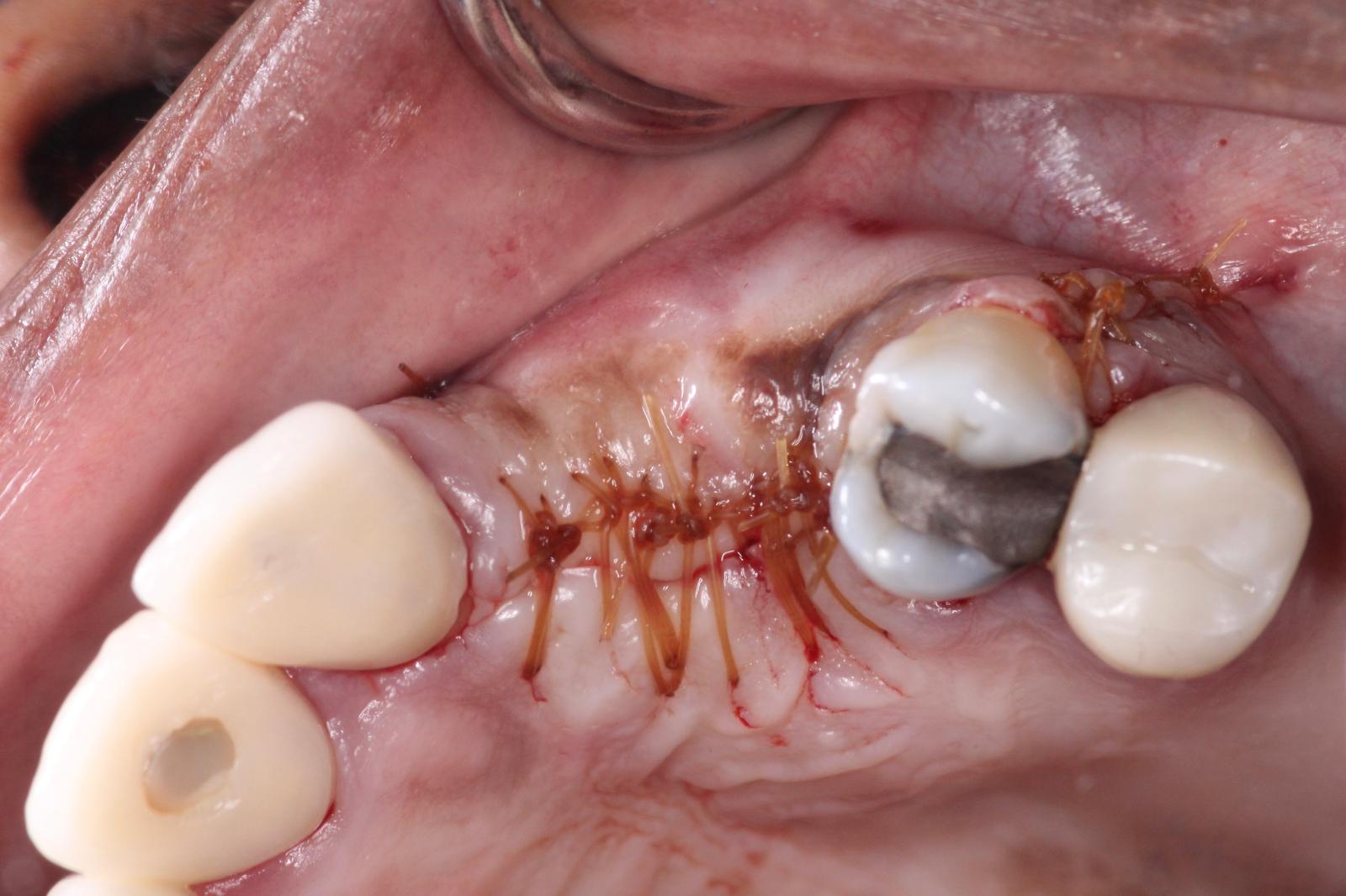 Finally, we sutured the site using Chromic Gut sutures. It is critical in GBR to get primary closure. In this particular case because of how much bone volume we are adding, a very deep periosteal release was done we we could pull over all the tissue from the buccal and suture the site as passively as possible. For more information this suturing technique, please see: Bone Regeneration of Extensive Socket Defects with Immediate Implant Placement