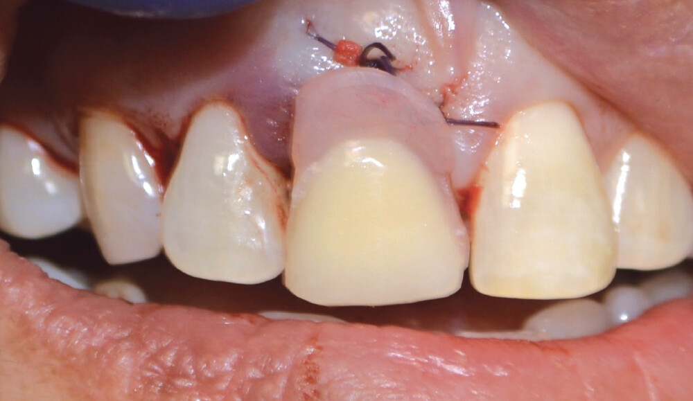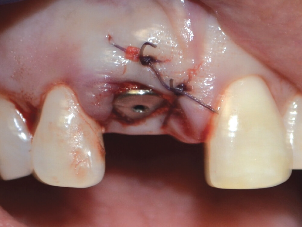 After the tooth was extracted, the site was thoroughly curetted. A pilot drill was used to begin the osteotomy, which was enlarged to the correct size for the implant. Prior to placing the implant, OsteoGen strip alloplast was re-hydrated with sterile saline and then placed in the socket against the wall adjacent to the gap. Hahn™ Tapered Implant (Glidewell Direct; Irvine, Calif.) was driven into place, and the graft material filled the gap. A healing abutment was placed and the site sutured with a Reli® REDISORB® PRO PGA 4-0 suture.
