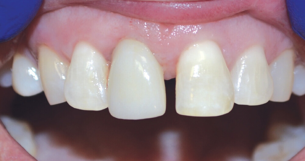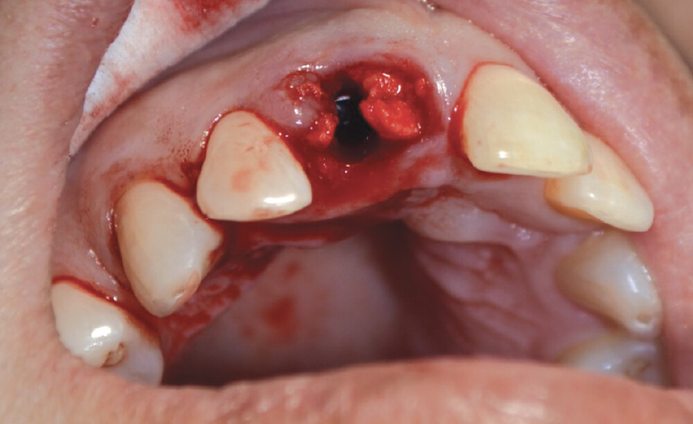 The patient presented with a failing tooth #8. After extraction, the socket shape resembled a triangle. Because of the round shape of the dental implant, there were gaps between the implant body and the alveolus which required grafting.