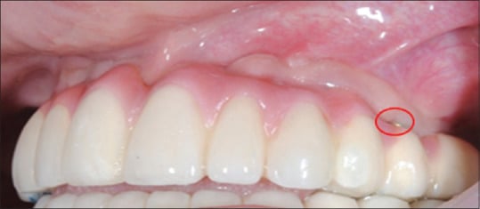 Gum recession around tooth number 25, revealing metal exposure and gap formation