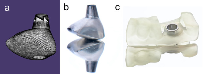 (a) The design of customization of healing abutment in form STL (Standard Triangle Language) file format, (b) The customized titanium healing abutment was milled from titanium blank, (c) The surgical template with a metal sleeve was designed following implantation plan.