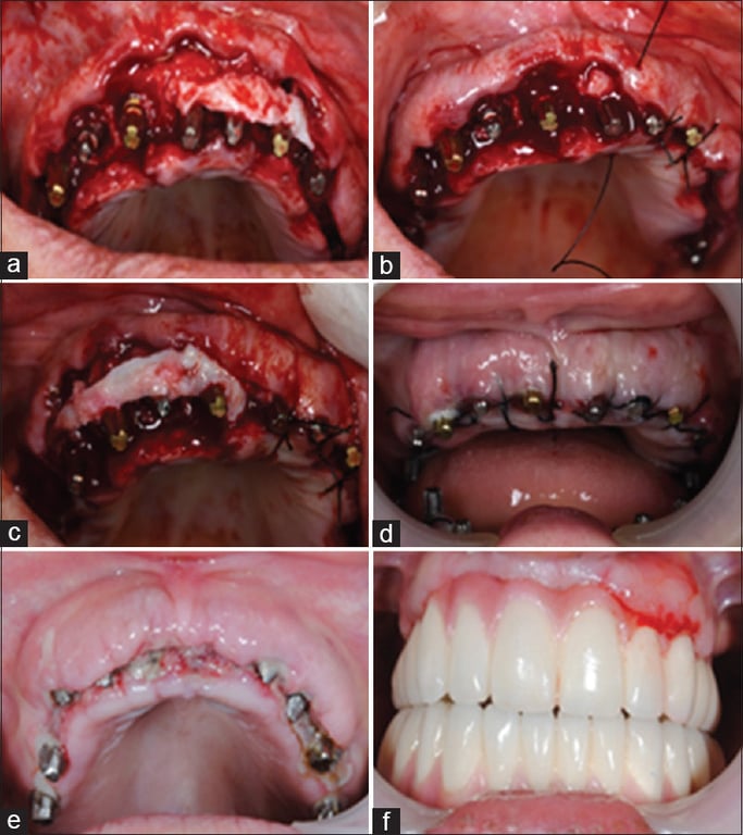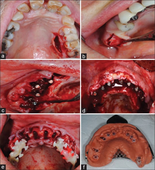 (a) A single-incision technique to minimise the donor site morbidity, (b) An abundance of soft tissue in the tuberosity area that should be removed for better positioning of the abutment head, (c) An abundance of palatine keratinised tissue after removing the granulation tissue and trimming the thin bony spicules, (d) A buccally repositioned de-epithelised palatal graft, (e) The impression is taken after the placement of the implants, before positioning the graft and suturing the flap, (f) Precise bone architecture is recorded to give proper orientation for the technician for marginal overcontouring of the bridge