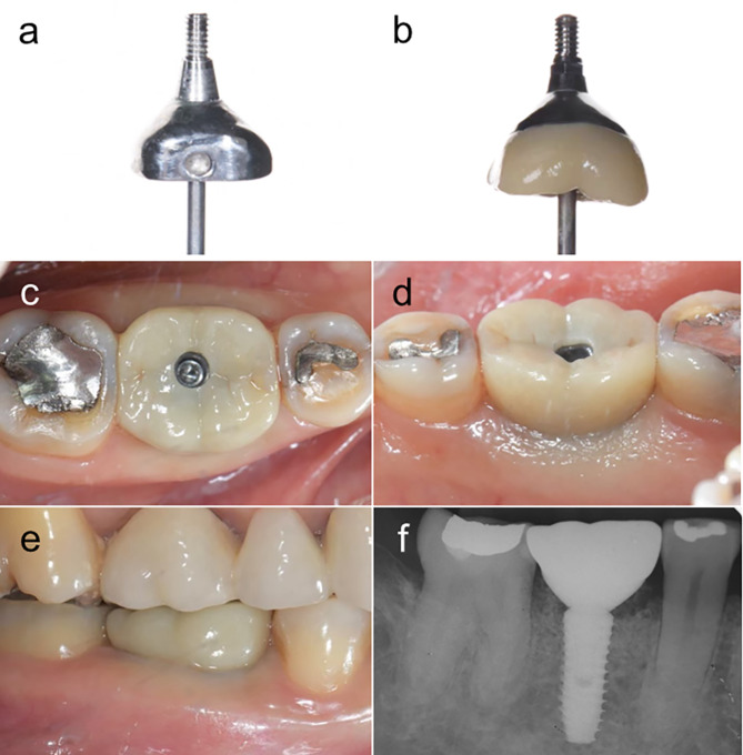 (a), (b) The outline form comparison between the customized titanium healing abutment and final prosthetic abutment with zirconia crown, (c) occlusal view, (d) lingual view, (e) buccal view, (f) radiographic examination: The final screw-retained implant prosthesis was complete after 6 months