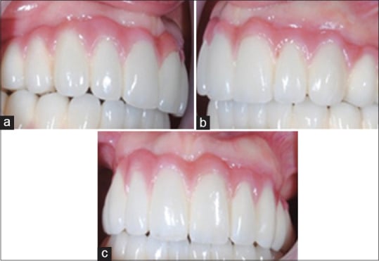 (a-c) 1-year and 6-month post-operative appearance, showing a good adaptation of healthy augmented mucosa to the margins of the prosthesis