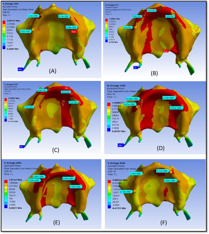 Stress distribution patterns in cortical bone across the six overdenture models based on the von Mises criterion. Each panel represents a different implant placement configuration: (A) Model 1 (5R–3R–3L–5L), (B) Model 2 (5R–3R–1L–3L), (C) Model 3 (5R–2R–3L–5L), (D) Model 4 (5R–4R–3L–5L), (E) Model 5 (4R–3R–3L–5L), and (F) Model 6 (6R–3R–3L–5L).The color scale indicates the magnitude of maximum principal stress in cortical bone, ranging from low stress (blue) to high stress (red). This qualitative visualization enables comparison of stress concentration patterns among the models. The reference model (A) exhibits a more uniform stress distribution, whereas certain asymmetrical configurations show localized stress peaks, highlighting areas at higher risk of overload and demonstrating the influence of implant position on biomechanical performance and bone preservation.