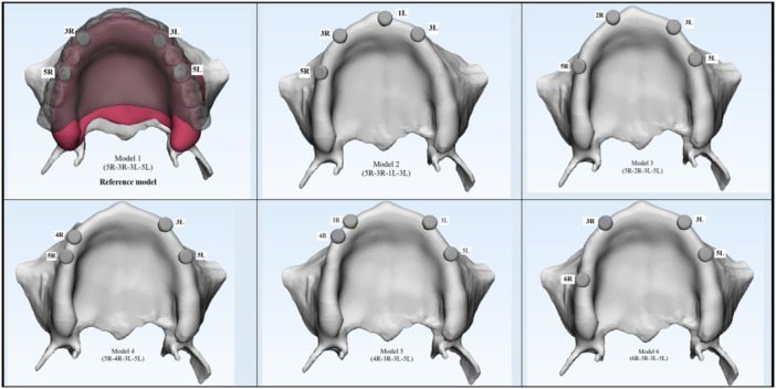 Schematic representation of six models of implant placement strategies.