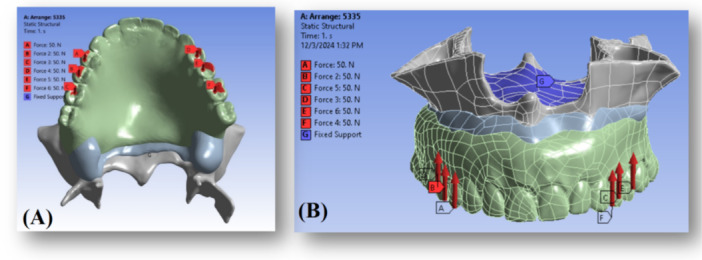 (A) An occlusal load of 300 N was applied bilaterally on the premolars and first molars (150 N per side) to simulate masticatory forces. (B) The surfaces constrained in all degrees of freedom are highlighted with blue dots, representing the fixed boundary conditions applied to the maxillary bone to prevent rigid body motion during simulation. These constraints ensure numerical stability and allow accurate calculation of stress distribution within the implant‐supported overdenture system.