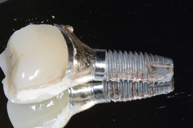 Metal corrosion from titanium implants ([Figure 1] may be an initiating factor for inflammation soft-tissue modifications and bone resorption. The mechanisms are not completely understood but may include titanium metal fatigue and stress, reaction to acidic by-products of the bacterial microbiome, chemical reactions to antimicrobial mouth rinses, mechanical damage to debridement by dental practitioners, and chemical reaction to certain diets and alcohol. Further research is required to elucidate these factors. 2