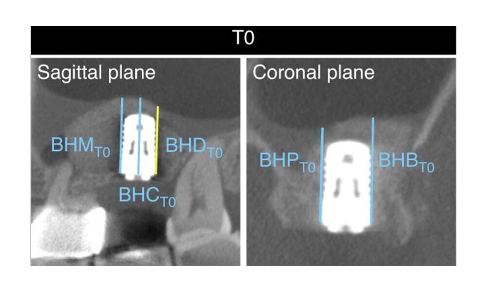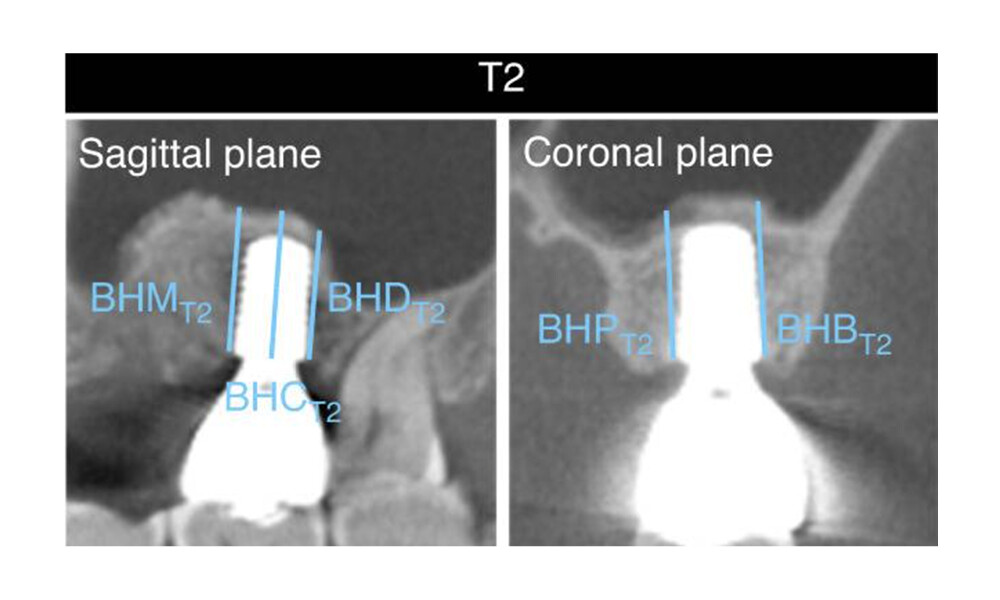 Radiographic assessment. Lower end of the line represents implant platform, upper end of the line represents uppermost level of the grafted sinus floor. T0: immediately after implant surgery; T1: before second-stage surgery; T2: at the last follow-up visit. BHT0, BHT1, BHT2: BH was measured at T0, T1 and T2 respectively. BH was measured at five aspects of each implant: central (BHC), mesial (BHM), and distal (BHD), buccal (BHB), and palatal (BHP) aspects