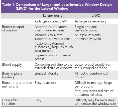 A recent study 1 addressed this very question and compared the efficacy and safety of less-lnvasive (LIWD) vs. large window designs (LWD) for lateral sinus lifts. Sixty LSFE (LIWD:30, LWD:30) with simultaneous implant installation were performed in a randomized controlled clinical trial on 60 subjects. The trials results suggested that: